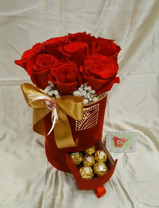 Ruže u kutiji, moderan i sofisticiran znak ljubavi i pažnje. Ruže su pripremljene tako da ostaju u kutiji i duže traju. Poklon kutija kvalitetne i fine izrade promjera (160x250), može poslužiti poslije za čuvanje dragih uspomena.Flower box je ispunjen ružama(15 kom) u gornjem djelu, a donji dio zauzima ladica koja je na povlačenje i napunjena je čokoladnim Ferrero rocher kuglama. Želite li veći broj ruža odaberite u padajućem izborniku.Možete odabrati između zlatne, ciklama boje (naglasite u napomeni ako želite) Želite li odabrati neki od naših poklona, i time još više uveseliti primateljicu, odaberite u padajućem izborniku