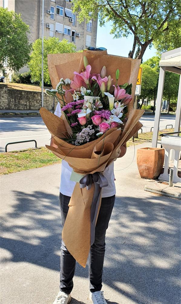 Pomodni, predimenzionirani XXL buketi neće ostaviti ravnodušnom niti jednu primateljicu.. Buket je napravljen od finog sezonskog cvijeca,po izboru aranžera, u rozim-lila tonovima koje trenutno imamo na stanju(slika je simbolična) Čestitajte i uljepšajte dan ovim fotogeničnim posebnim buketom. Na slici je prikazan buket u **premium veličini..Ukoliko želite veći buket od standardnog povećajte količinu cvijeća u padajućem izborniku. Želite li dodatno uveseliti primateljicu odaberite neki od naših ponuđenih poklona..